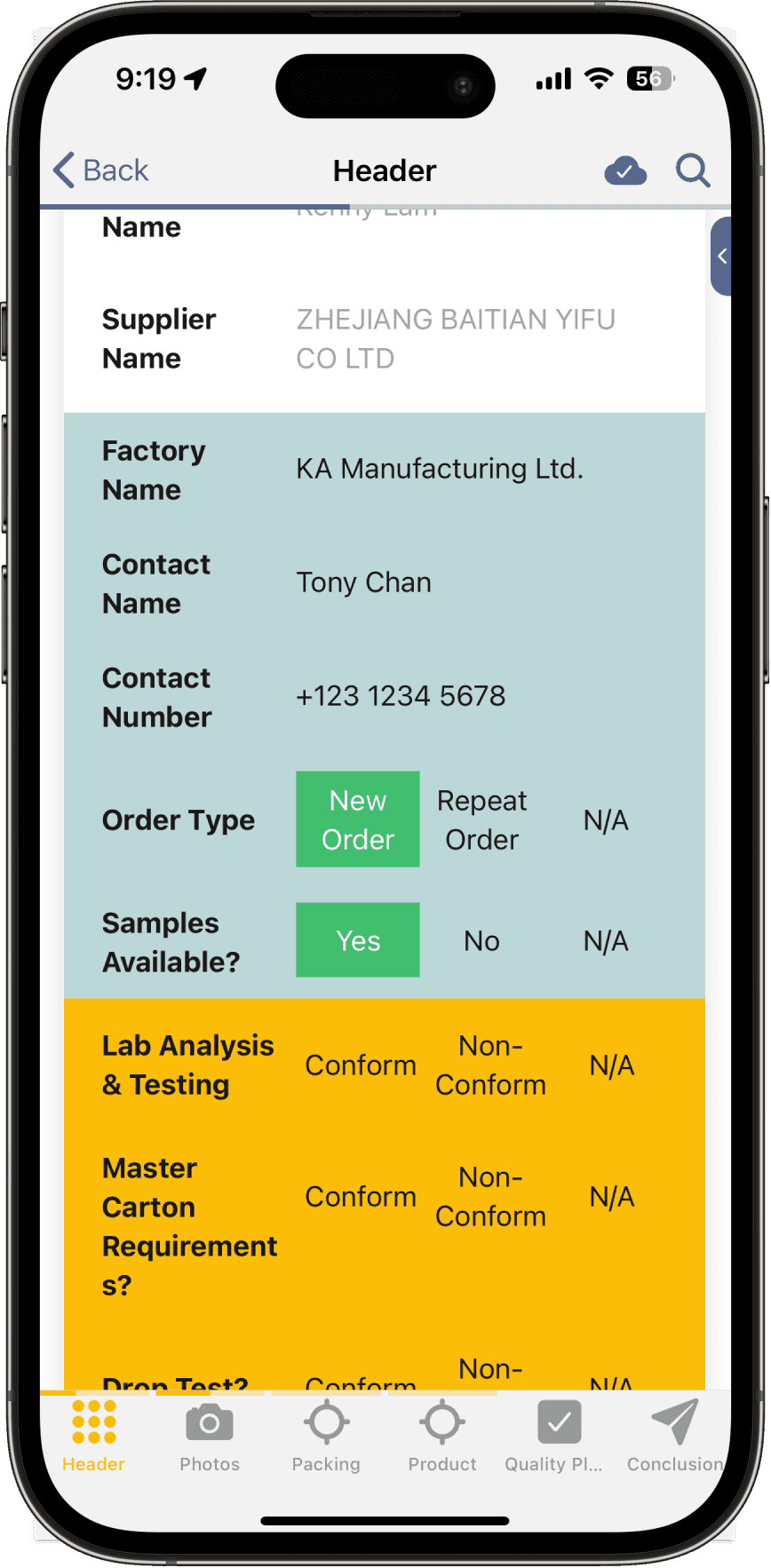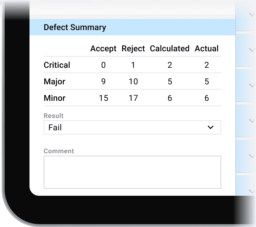 In the summary section, the result is calculated by a industry rule call AQL. This rule determine whether the numbers of defect found (e.g. critical or major defect) is accept or reject.